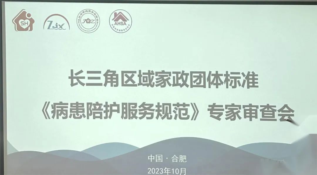2023年10月16日,長三角區域家政團體標準《病患陪護服務規范》專家審查會在安徽合肥召開,浙江家協會長陶曉鶯、上海家協會長孫美娥、江蘇家協會長張喬、安徽家協會長林清、各省市協會秘書長、各省市專家評委及相關部門負責人參加會議。