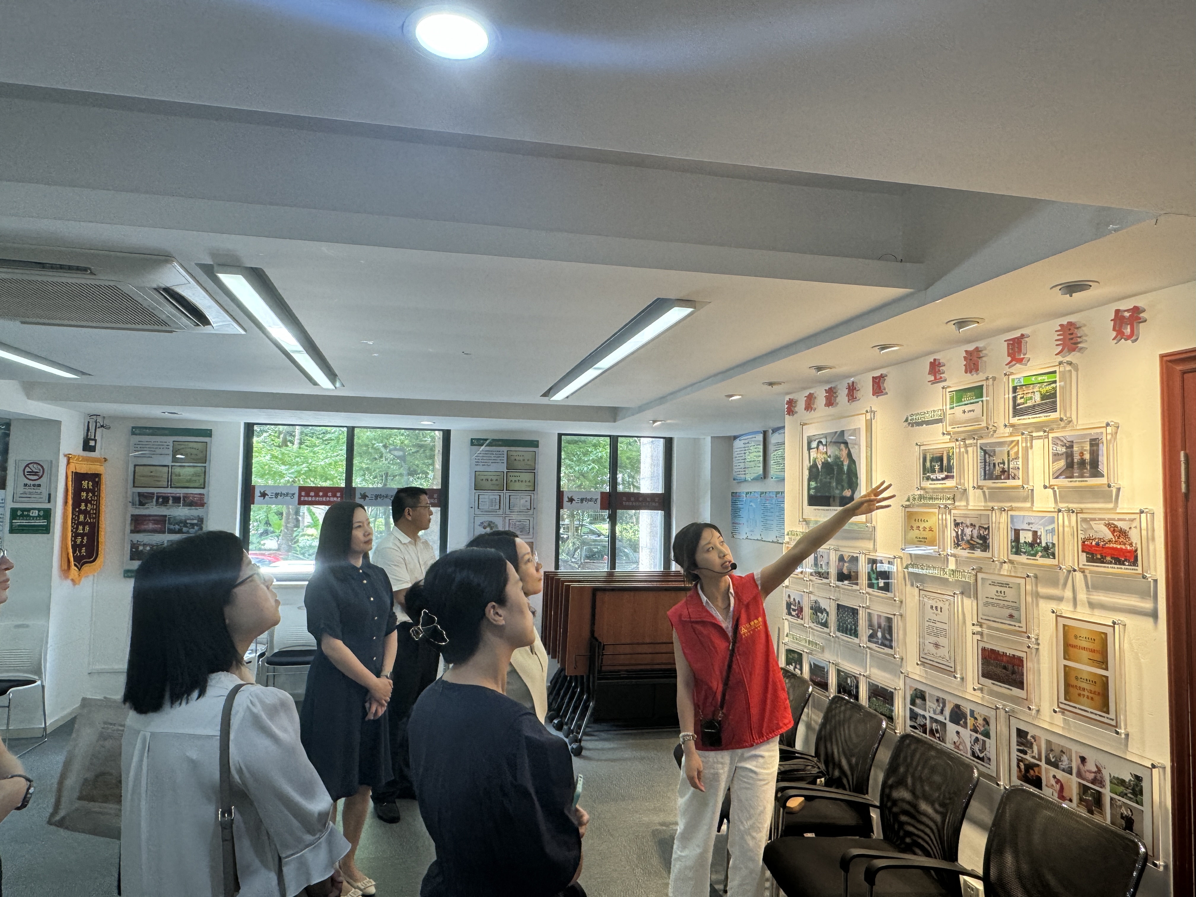 三替工作人員向各位領導介紹三替家政進社區的相關活動