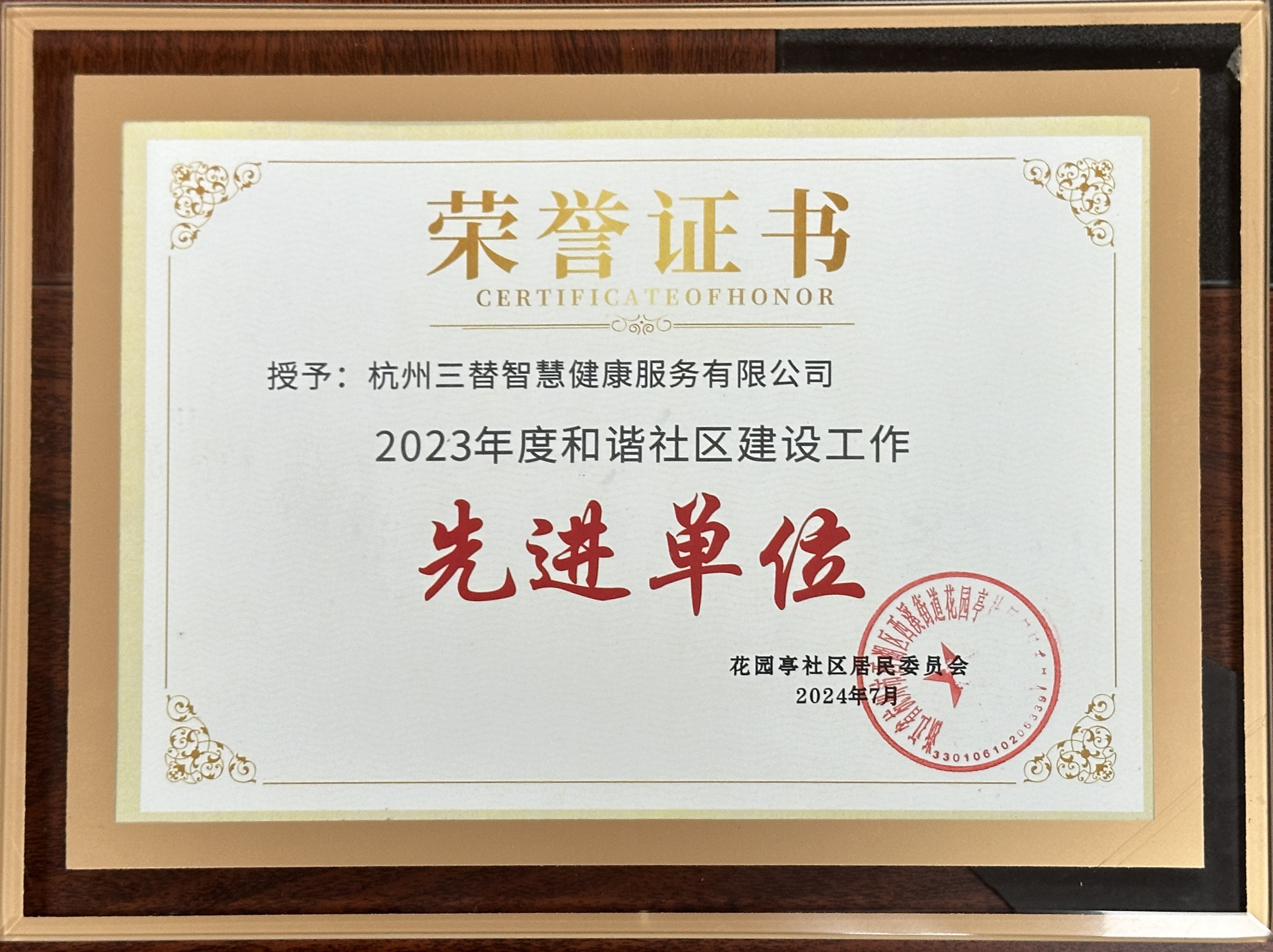 三替集團榮獲“2023年度和諧社區建設工作先進單位”