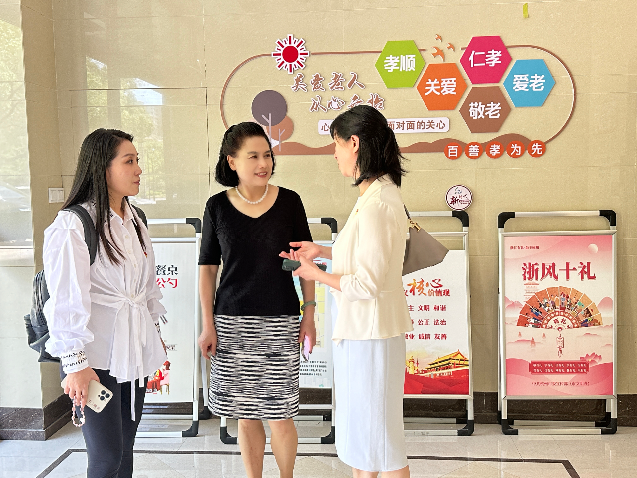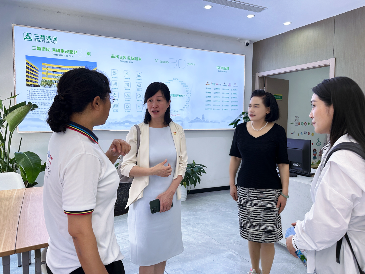 7月4日,潮聞天下傳媒黨委副書記、總經理吳雅茗,潮聞天下傳媒管委委員、財經中心主任王曉露,潮新聞財經中心財經觀察部副主任王靜等領導蒞臨三替集團蕭山社區服務網點實地調研,參觀三替在社區養老服務、家政培訓進社區、家政網點建設等方面的工作經驗與成果,三替集團董事長陶曉鶯等相關工作人員陪同參觀調研。
