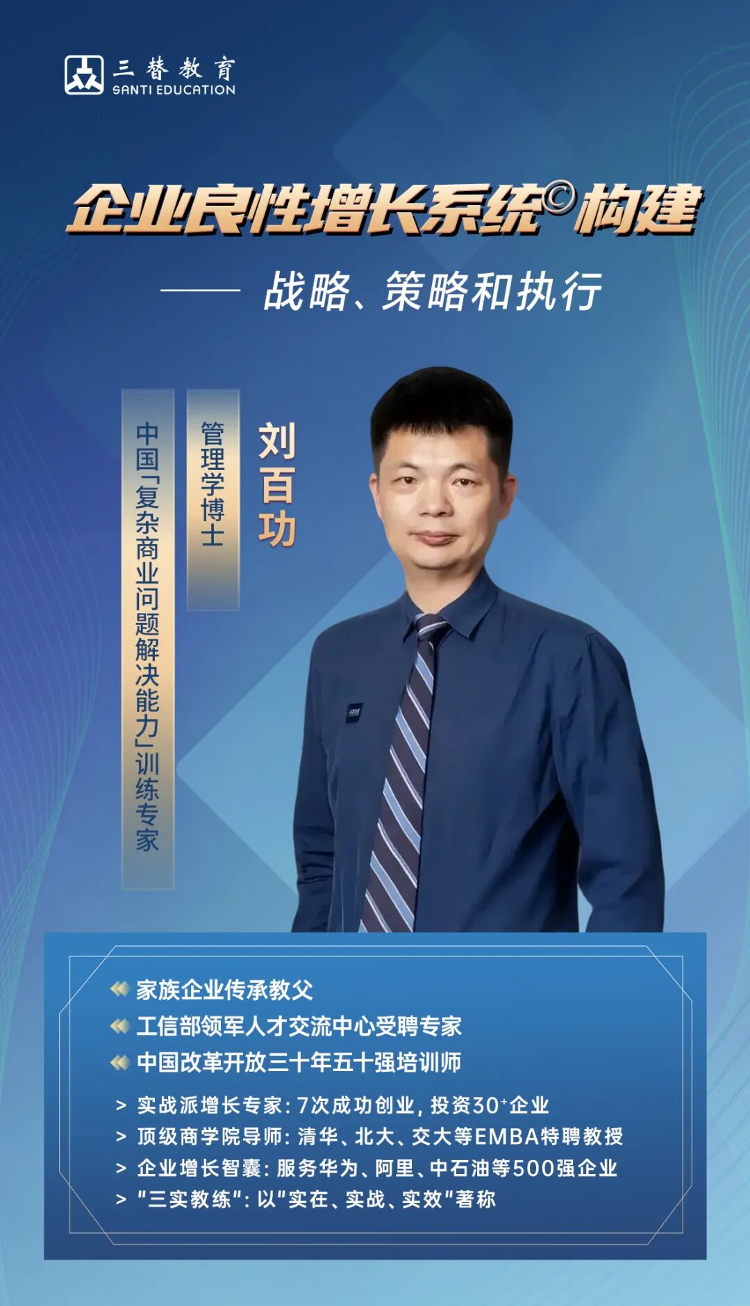 本次課程特邀知名企業增長實戰專家、中國“復雜商業問題解決能力”訓練專家——劉百功博士親授。劉博士兼具深厚學術背景與豐富實業經驗,是工信部領軍人才交流中心受聘專家、多所頂尖商學院EMBA特聘教授。曾先后7次創業,參與投資30多家企業,取得驕人成績,并長期為華為、阿里、中石油等500強企業提供戰略與增長咨詢,以“實在、實戰、實效”的教學風格深受企業界推崇。劉博士用經過實戰驗證,行之有效的理論和方法幫助中國企業,特別是中小企業深刻理解什么是良性增長,并深度賦能、陪伴企業家,領跑企業一同實現良性增長!