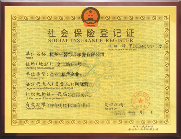 在陶曉鶯的辦公室里,保留著一個1999年辦理的“社會保險登記證”,組織機構統一代碼的最后一位是“1”,她有些自豪地解釋,因為三替是杭州市第一家為員工買社保的民營企業。