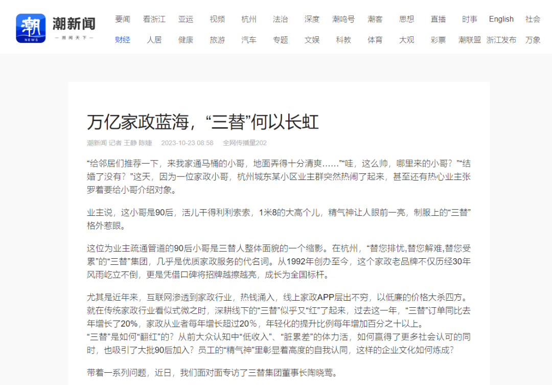 這位為業主疏通管道的90后小哥是三替人整體面貌的一個縮影。在杭州,“替您排憂,替您解難,替您受累”的“三替”集團,幾乎是優質家政服務的代名詞。從1992年創辦至今,這個家政老品牌不僅歷經30年風雨屹立不倒,更是憑借口碑將招牌越擦越亮,成長為全國標桿。