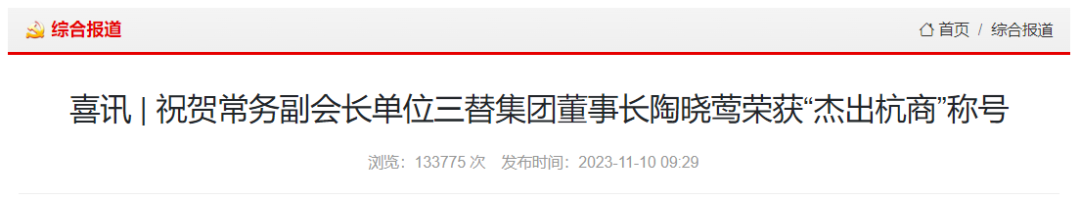 11月10日,三替集團董事長陶曉鶯榮獲“杰出杭商”稱號的文章被全國基層黨建網轉載刊登,瀏覽量突破10萬次。全國基層黨建網是全國性黨建工作學習交流、信息資源發布的基層黨建新聞門戶網站,其刊發原文如下: