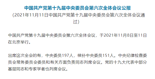 【黨政要聞】中國共產黨第十九屆中央委員會第六次全體會議公報發(fā)布于:2021-11-12 -