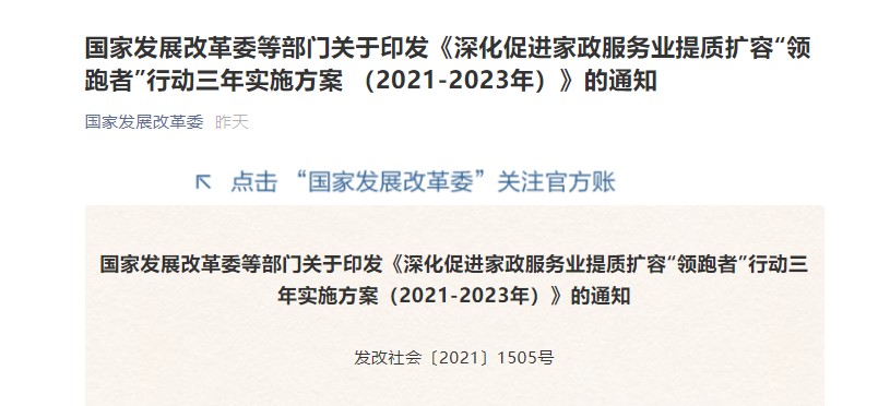 國家發(fā)展改革委等十五部門聯(lián)合印發(fā)《深化促進家政服務業(yè)提質擴容“領跑者”行動三年實施方案(2021—2023年)》發(fā)布于:2021-11-09 -