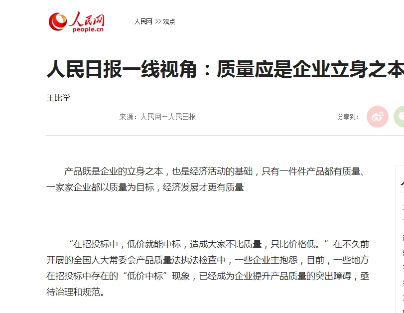 人民日報:“最低價中標”危害極大,質量應是企業(yè)立身之本!發(fā)布于:2022-06-08 -